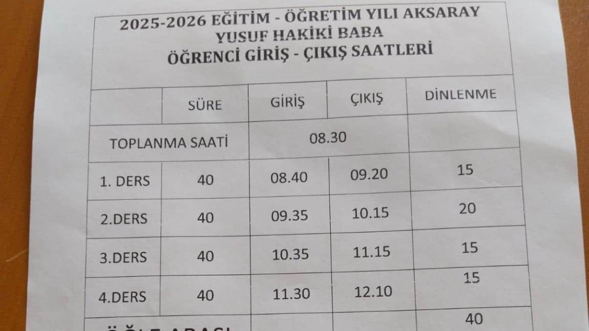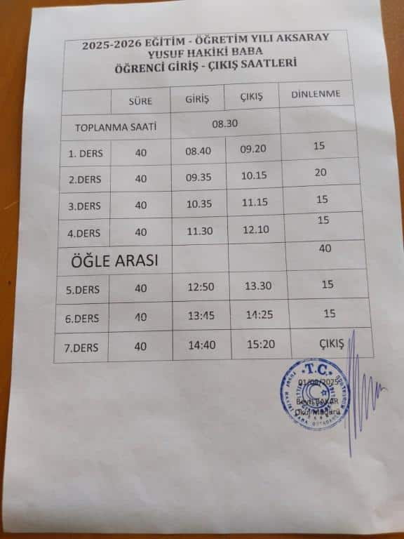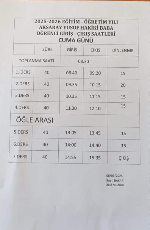 Okulumuz Cuma Günü Zaman Çizelgesi